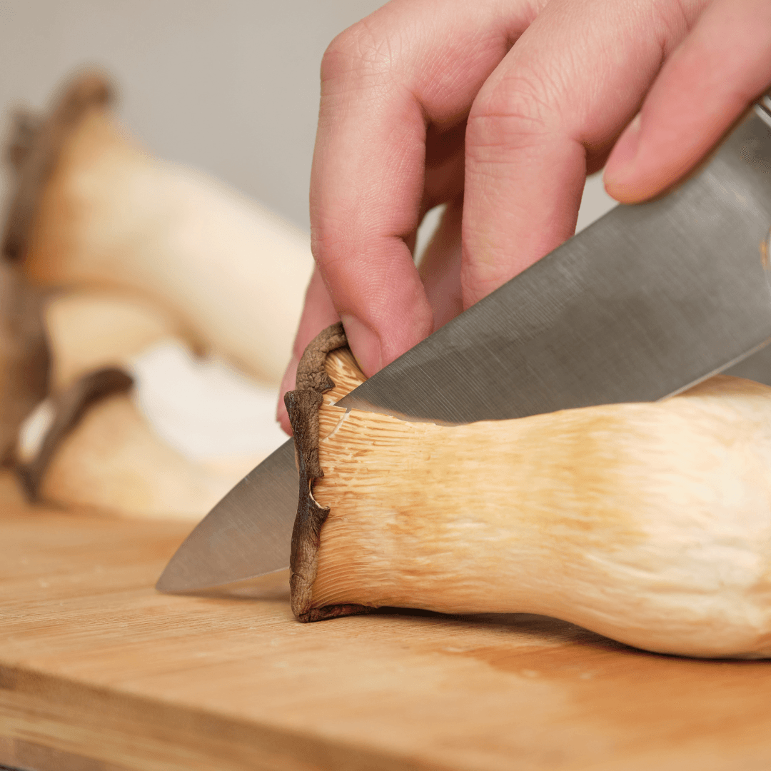 Start by cleaning the King Trumpet Mushrooms gently with a damp cloth to remove any dirt or debris. Trim the tough ends of the stems, and slice the mushrooms lengthwise into 1/2 inch thick slices.