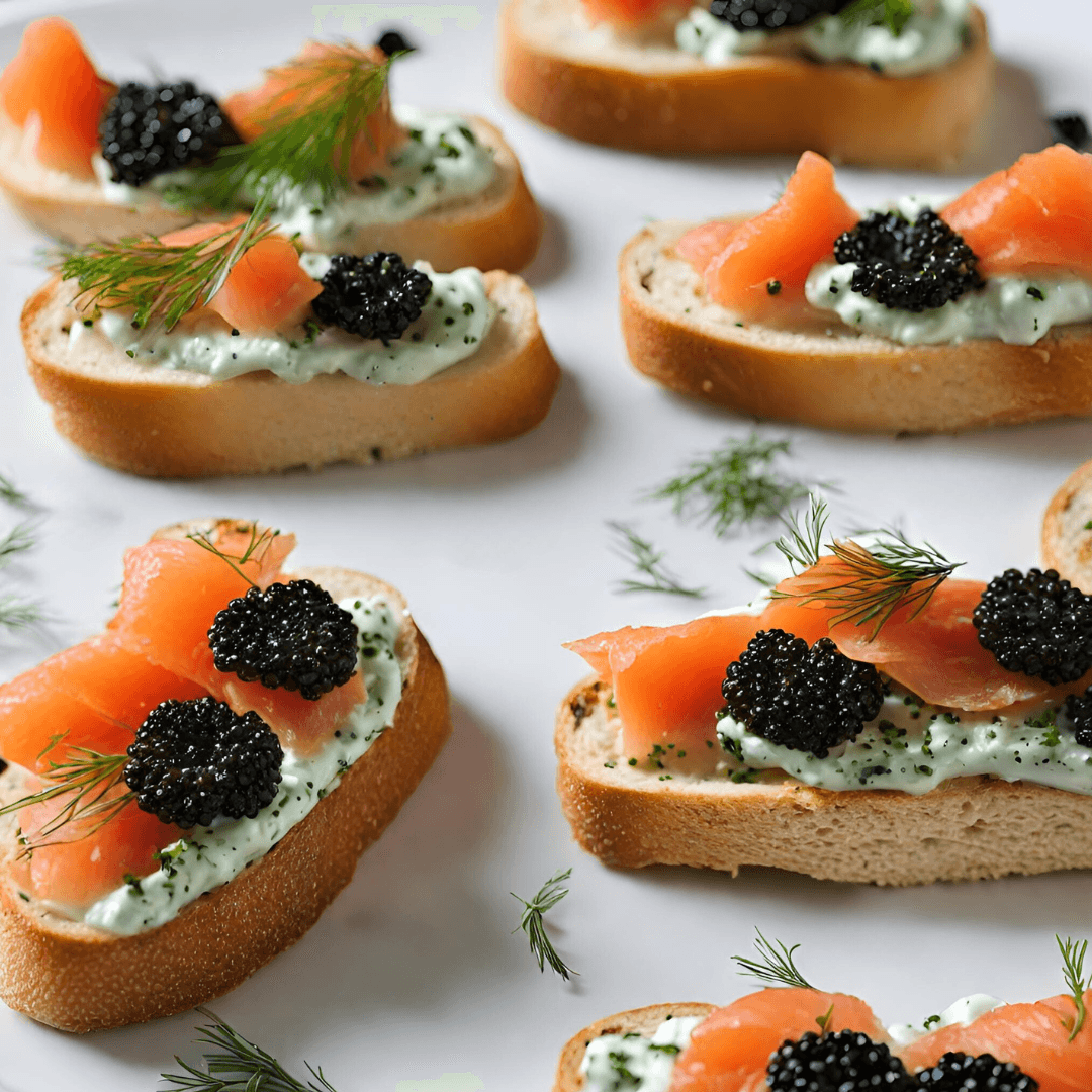 Spoon a small amount of Ossetra Caviar atop the smoked salmon on each baguette slice.