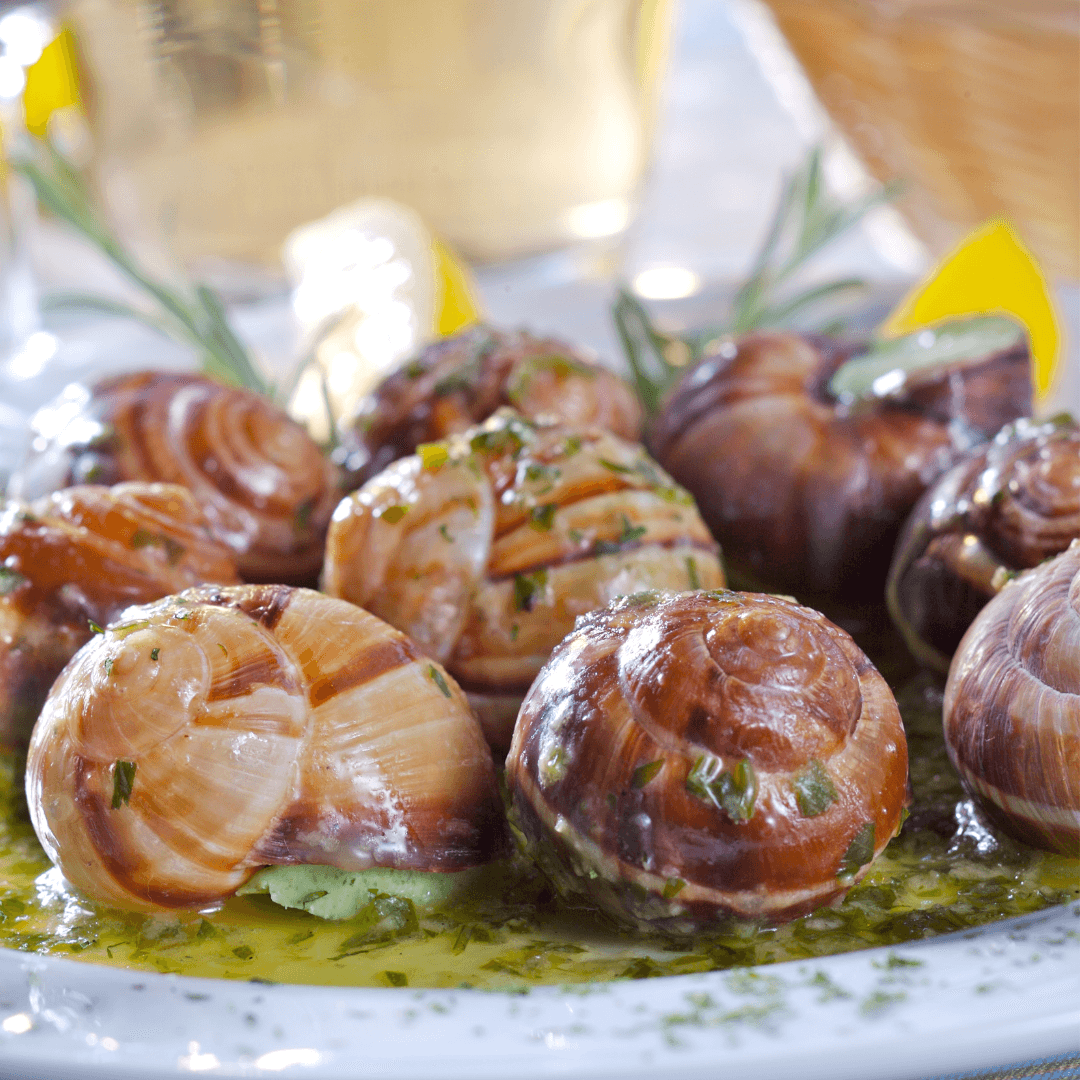 Escargot are a delicacy consisting of cooked land snails, most commonly enjoyed in French cuisine. They are often prepared with garlic butter, wine, or a parsley sauce and served in their shells or in special dishes designed for escargot.