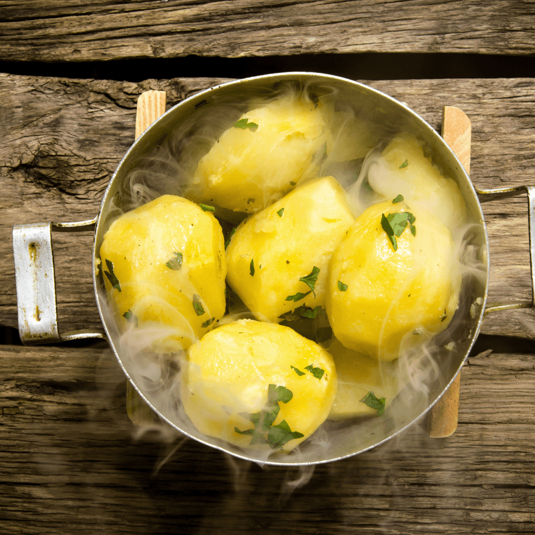 Start by boiling the potatoes in a large pot until tender, about 15 minutes. Drain and set aside.